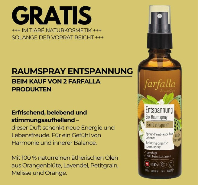 Sonne für die Seele - Das naturreine Raumspray ENTSPANNUNG von Farfalla bringt Leichtigkeit, Lebensfreude und gute Laune in dein Zuhause. 🤍 Jetzt als Geschenk: Kauf 2 Farfalla Produkte und erhalte dein Raumspray gratis dazu!